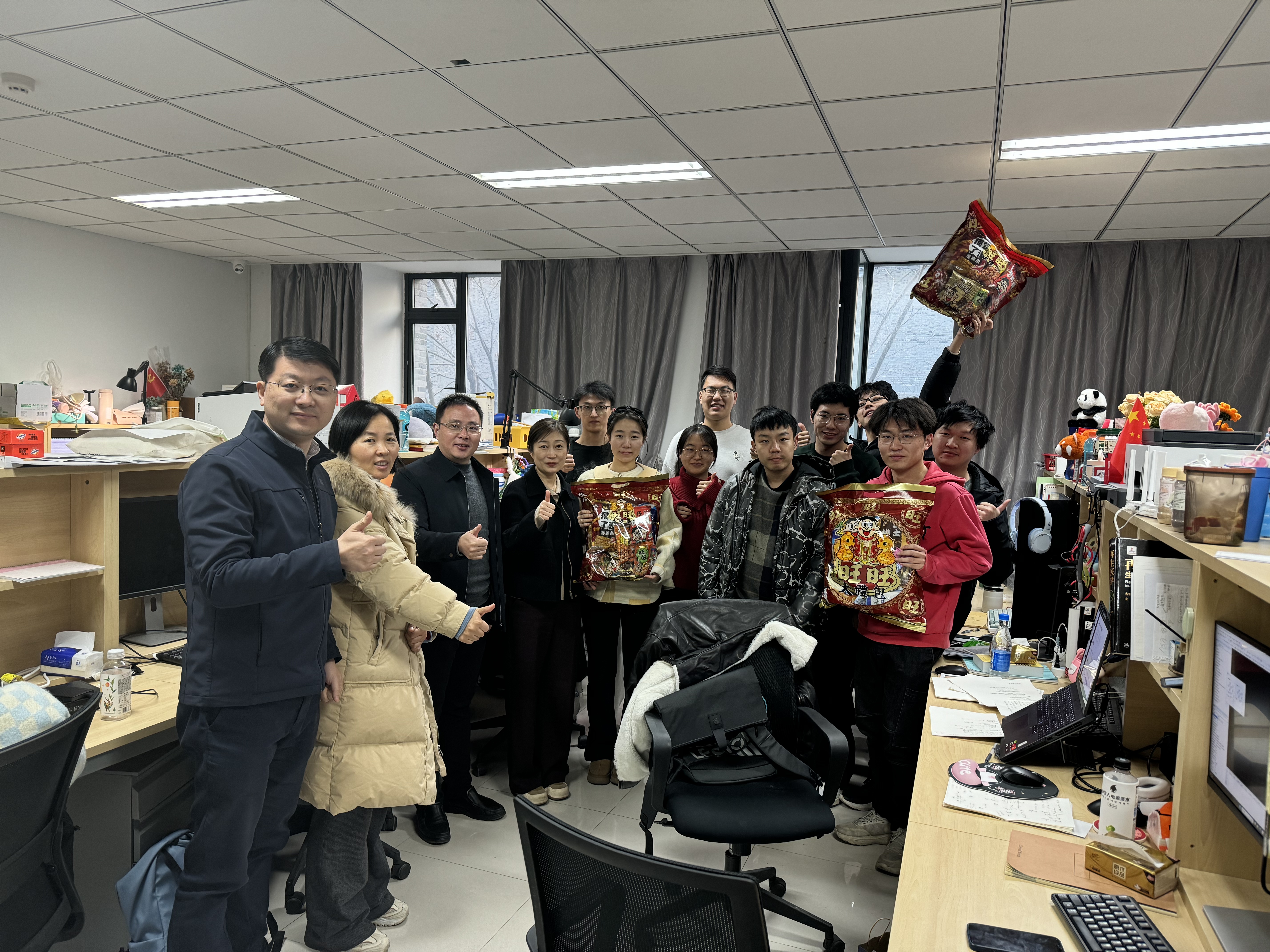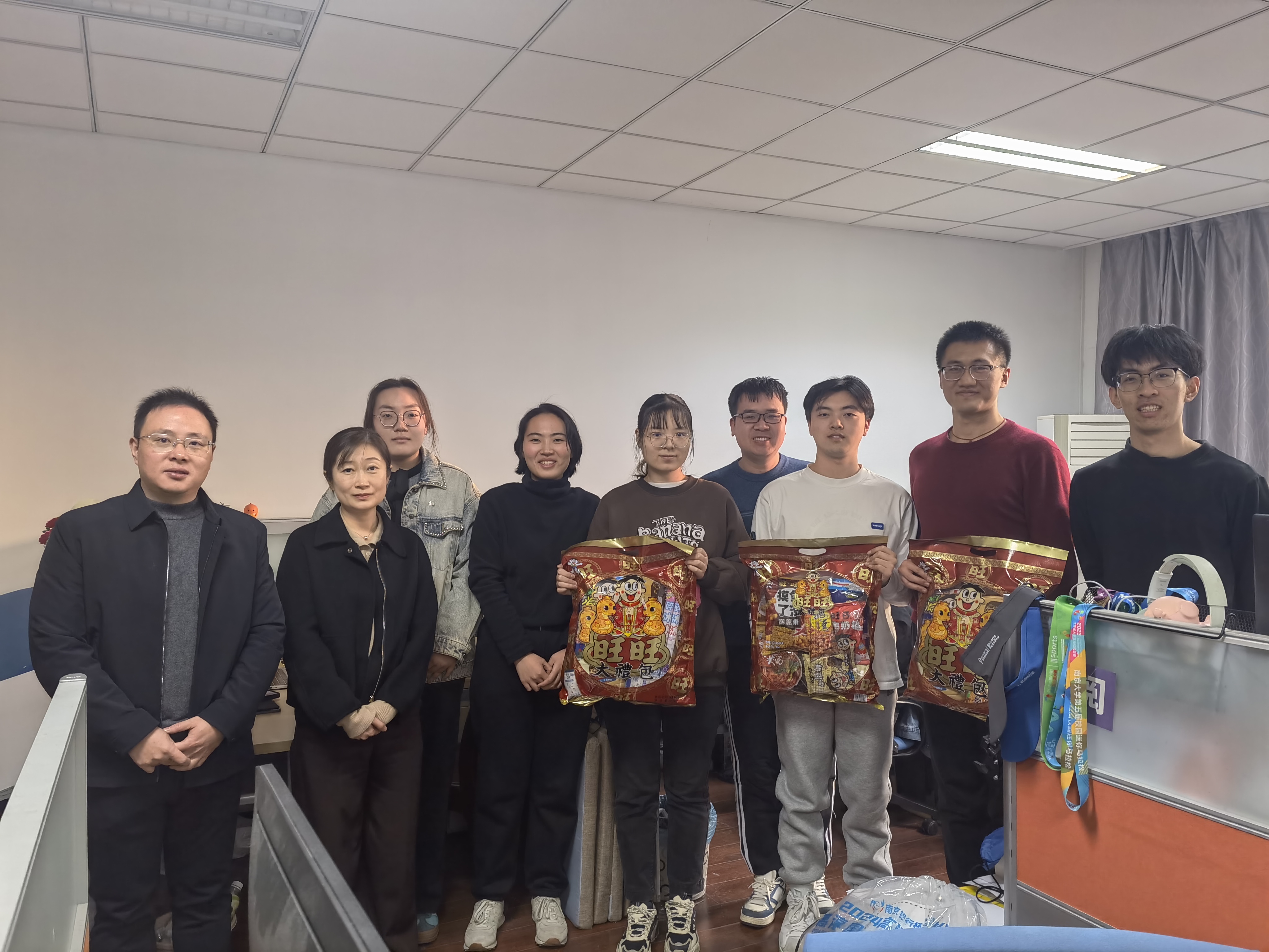 在公司研究生办公室,周媛、周安、董昊等走近同学们身边,送上新年旺旺大礼包,表达了关怀和问候。周媛表示,新年新气象,希望同学们牢记习近平总书记建设“第一个南大”的殷切嘱托,认真落实习近平总书记重要回信精神,继承和发扬南大人报国传统,鼓励同学们不断探索科学高峰,为推动国家高水平科技自立自强、建设“第一个南大”奋力前进。