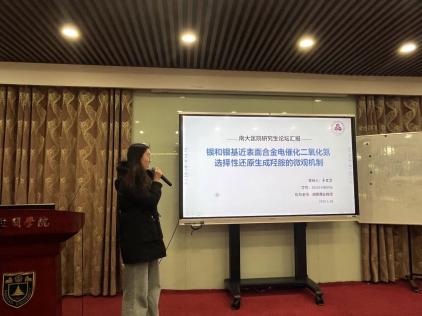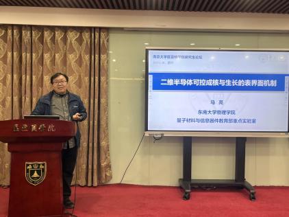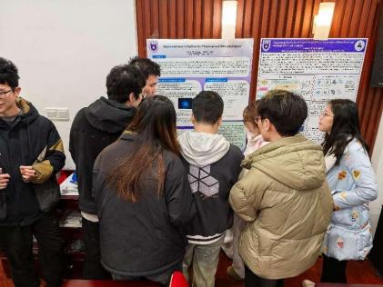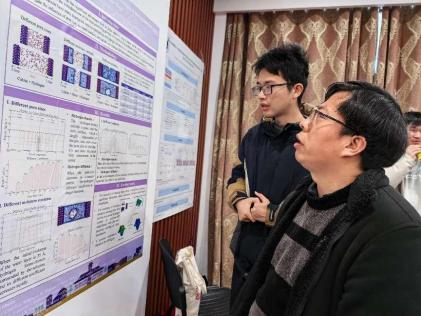 论坛分为学术报告和海报讨论两个环节。在学术报告环节,首先由本次论坛的特邀嘉宾东南大学马亮教授与中国药科大学刘金峰副教授开展学术报告。马亮教授分享了他的团队在二维半导体可控成核与生长的表界面制探究的成果,刘金峰副教授介绍了他的团队对于水溶液的高精度机器学习势能面的最新进展。随后,公司各课题组的七位研究生同学们依次登台,展示了自己近期在科研领域的成果。高星杰同学通过建立生物网络模型,探究了免疫微环境调控对于肿瘤细胞命运抉择的影响;赵苗苗同学介绍了一种基于生成式模型的增强采样方法DA2-VAE;张橙同学在结构受限磷化合物活性算符的理论研究中取得较大进展;于文洁同学探究了银和银基近表面合金电催化二氧化氮选择性还原生成羟胺的微观机制;李俊艾同学报告了在活性膜的分子动力学模拟工作中取得的成果;朱颖同学在脂质过氧化物对于GPCR功能的影响研究中取得阶段性的进展;孔铁霖同学汇报了铁电极化忆阻器的含时电流模拟工作的研究。精彩的学术报告引发了师生的热烈讨论,拓宽了同学们的学术视野。