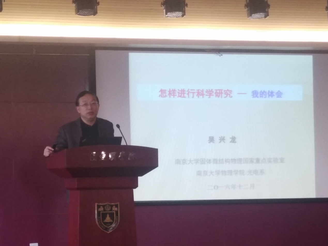 12月7号下午,太阳成集团tyc物理公司教授、博士生导师,物理公司副经理兼物理公司党委副书记吴兴龙教授在太阳成集团tyc国生报告厅,为全体15级拔尖计划同学带来了一场以“怎样进行科学研究-我的体会”为主题的讲座。吴教授长期从事半导体纳米材料的拉曼散射和发光特性研究,曾获江苏省科技进步一、二等奖,国家自然科学四等奖,第六届江苏省青年科技奖等。