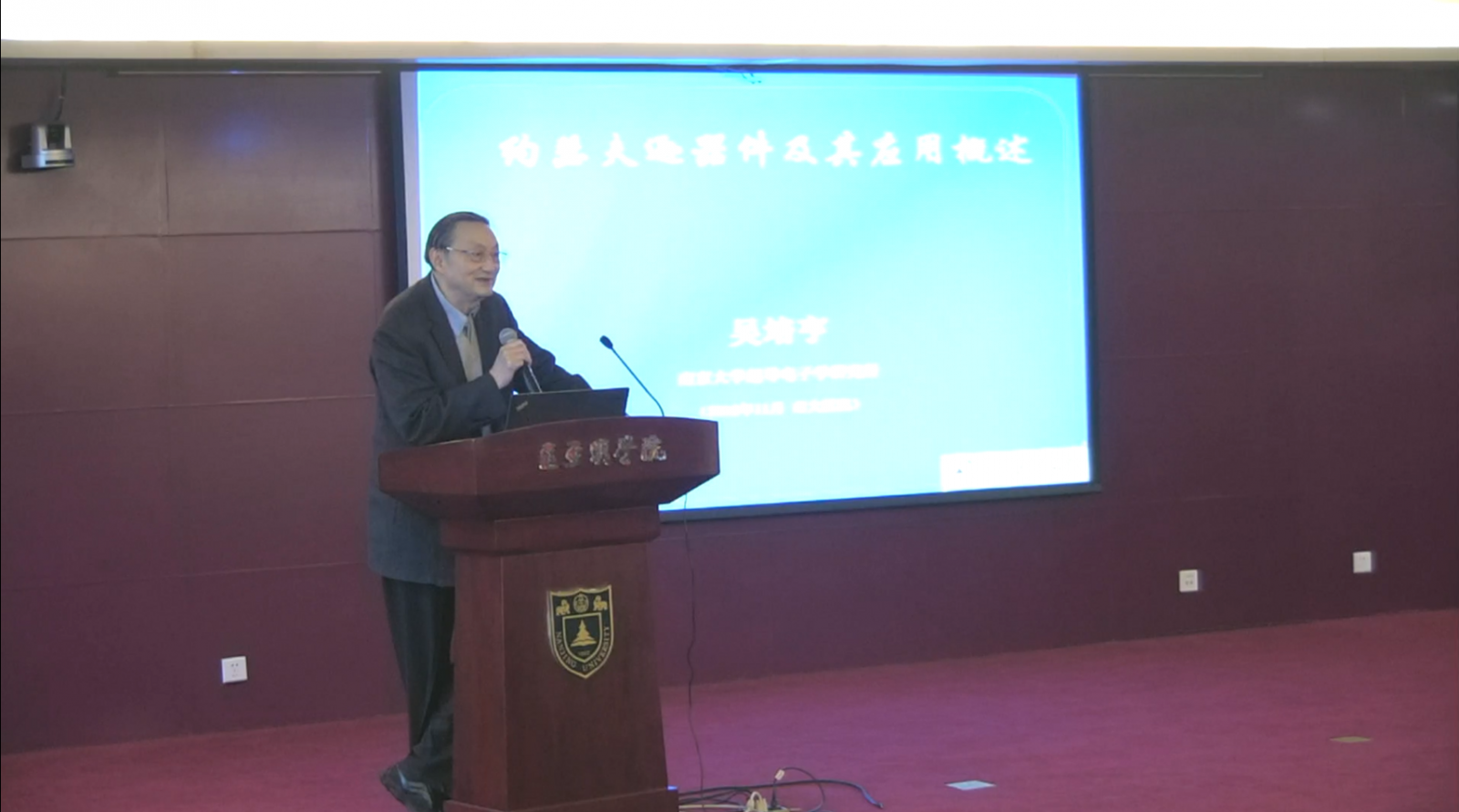 吴院士首先向我们简单的介绍了超导电性的概念,即当温度降至很低时,许多材料的直流电阻突然消失,并呈现完全抗磁性的性质,从而进一步引出了临界温度、临界磁场和临界电流密度的概念,并配合PPT上的几幅图像向同学们生动地讲解了在温度下降到临界温度的过程中材料各种性质的变化。而后,吴院士又提到了超导体应用于电子学的物理依据和超导体的应用。在电工方面,超导体的一个重要应用是制备强磁场;而在电磁方面,现在超导体有三个主流方向的应用,分别是利用超导态-正常态的相变(转变边缘界上的尖锐转变)做滤波器、谐振器以及超导单光子检测器SSPD、利用薄膜的微波表面电阻实现移动通信地面基站以及电子对隧道效应(Josephson效应)和准粒子隧道效应和超导量子干涉器。