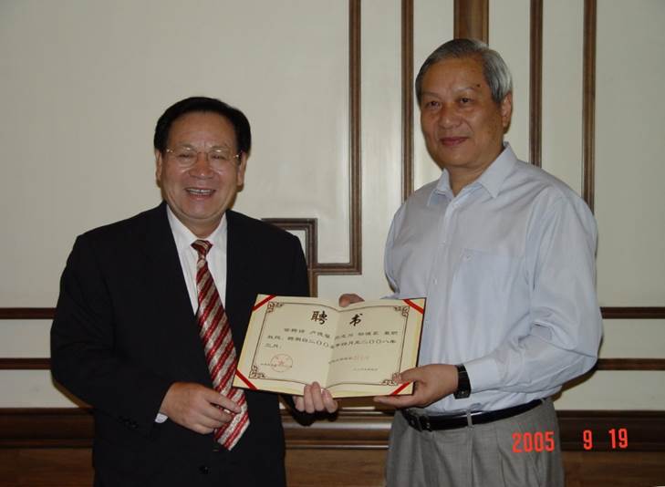 上图:2005年,卢德馨教授受聘为清华大学兼职教授(顾秉林董事长颁发聘书)