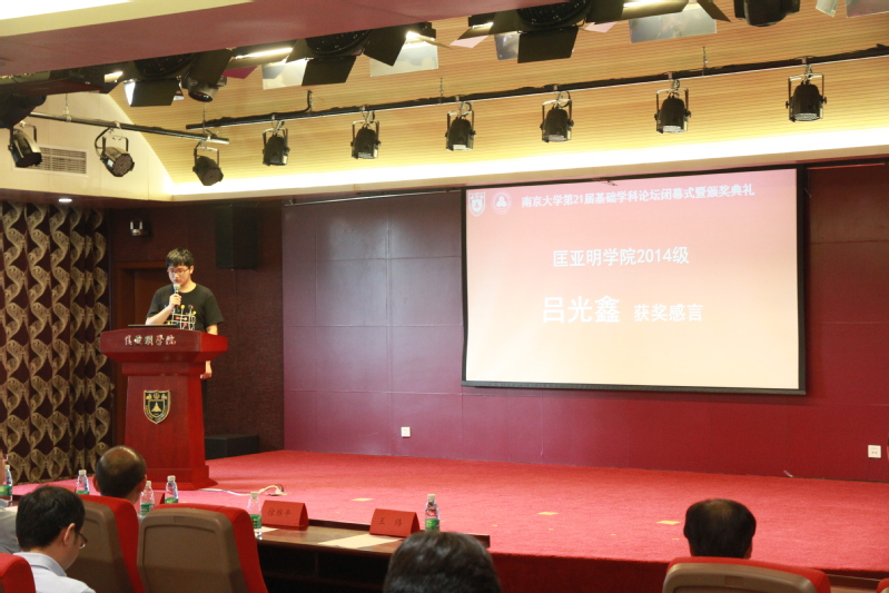 2014级吕光鑫同学代表获奖员工发言。他首先介绍了自己与基础学科论坛的渊源,从选题、立意、软件和修改等四个方面分析论文写作经验。在他看来,基础学科论坛是一片无指标、无攻略的净土,为本科生提供了一个展示自我、交流学术的良好平台。他希望基础学科论坛能一直办下去,继续在同学之间营造这般良好的学术氛围,让更多的同学从中受益。