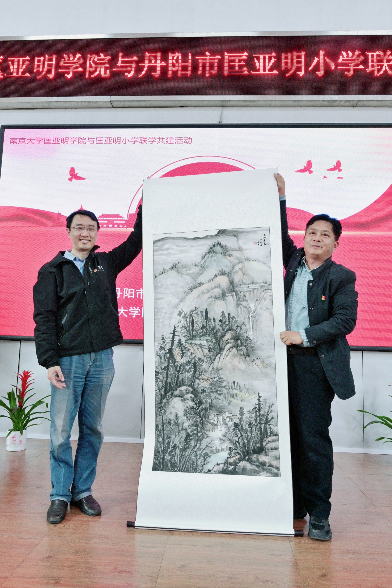 匡亚明小学党支部书记蔡建良先生向公司党委书记、经理王骏回赠画作,以一副亲笔所绘的山水画,祝愿两校情谊“山高水长”。