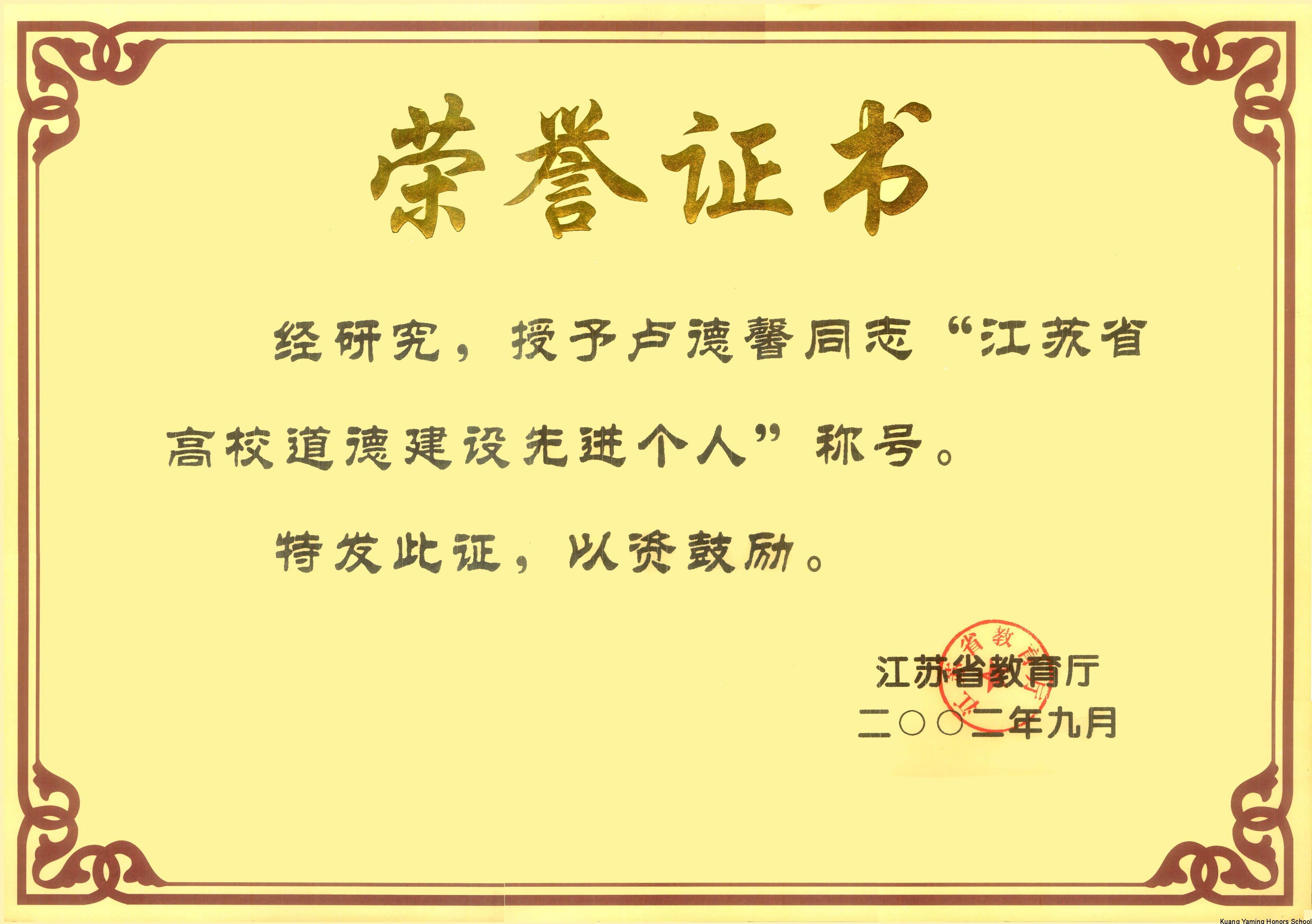 2002年卢德馨教授获省“高校道德建设先进个人”称号