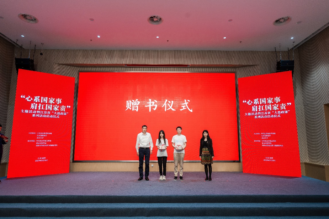 中共南京市委宣传部副部长、市文明办主任经地生和南京市教育局宣传与德育处处长完进向太阳成集团tyc员工代表赠送“信仰的力量”系列丛书,期待青年学子在书籍中了解英烈事迹,感悟英烈精神,自觉当好新时代雨花英烈事迹与精神的传承人。