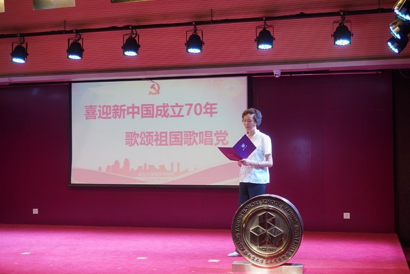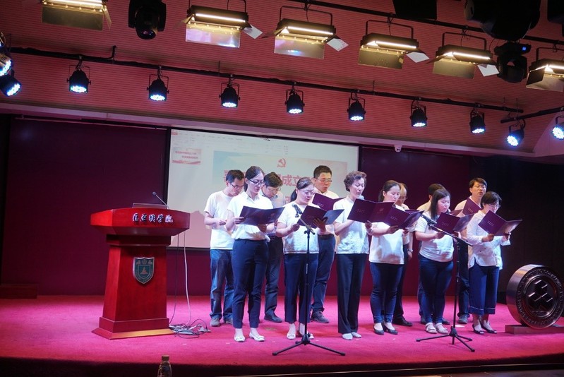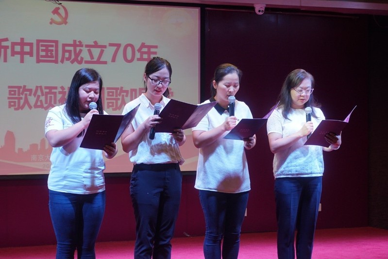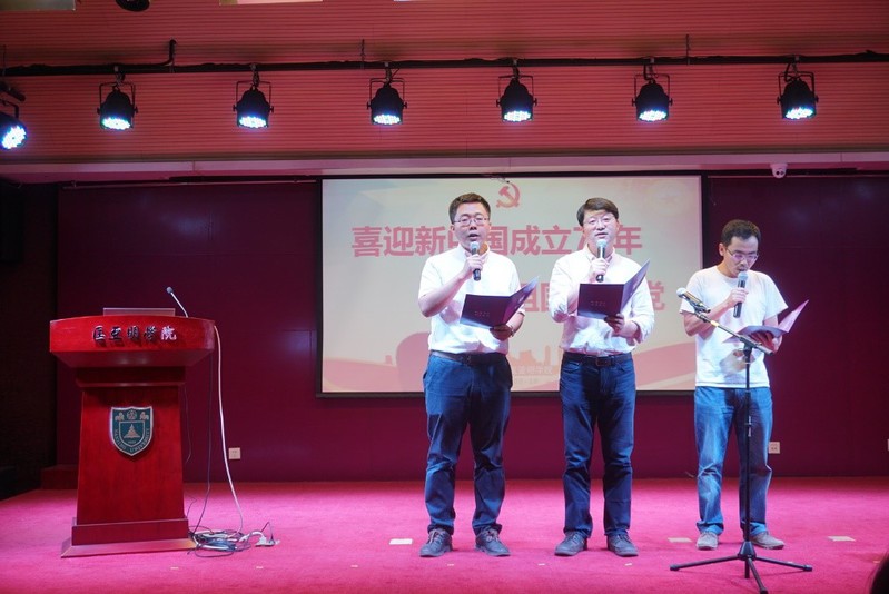 教工党支部的女老师代表共同朗诵了毛主席的经典诗词《沁园春·雪》,员工党支部朗诵了原创现代诗《祖国颂》,5名研究生党员带来了女生小合唱《没有共产党就没有新中国》。在这些热情洋溢的赞颂祖国、歌唱党的诗词与歌曲中,在场师生都深切感受到,正如习近平总书记在十九大报告中所说的,今天,我们比历史上任何时期都更接近、更有信心和能力实现中华民族伟大复兴的目标。