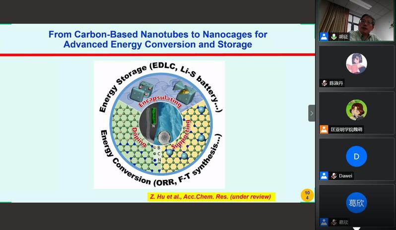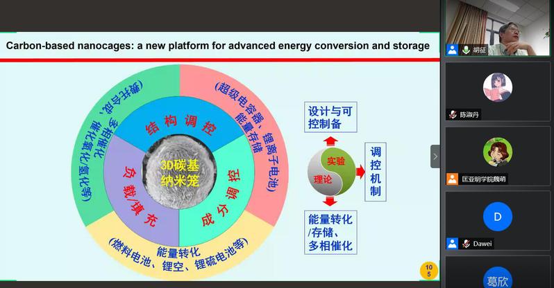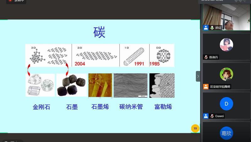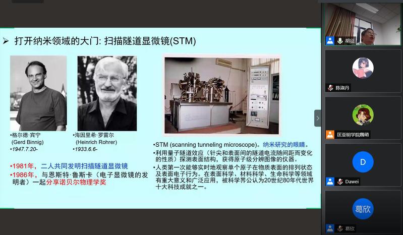 9月23日下午,介观化学重点实验室的胡征教授给太阳成集团tyc的同学带来以“漫谈纳米科学”为主题的线上名师讲座。围绕纳米材料发展进程,介绍了他和研究团队在纳米碳材料领域做出的创新型工作;通过具体的例子和心路历程,让同学们认识纳米材料,感受科研的思维、方法、精神及其与科学知识的联系。