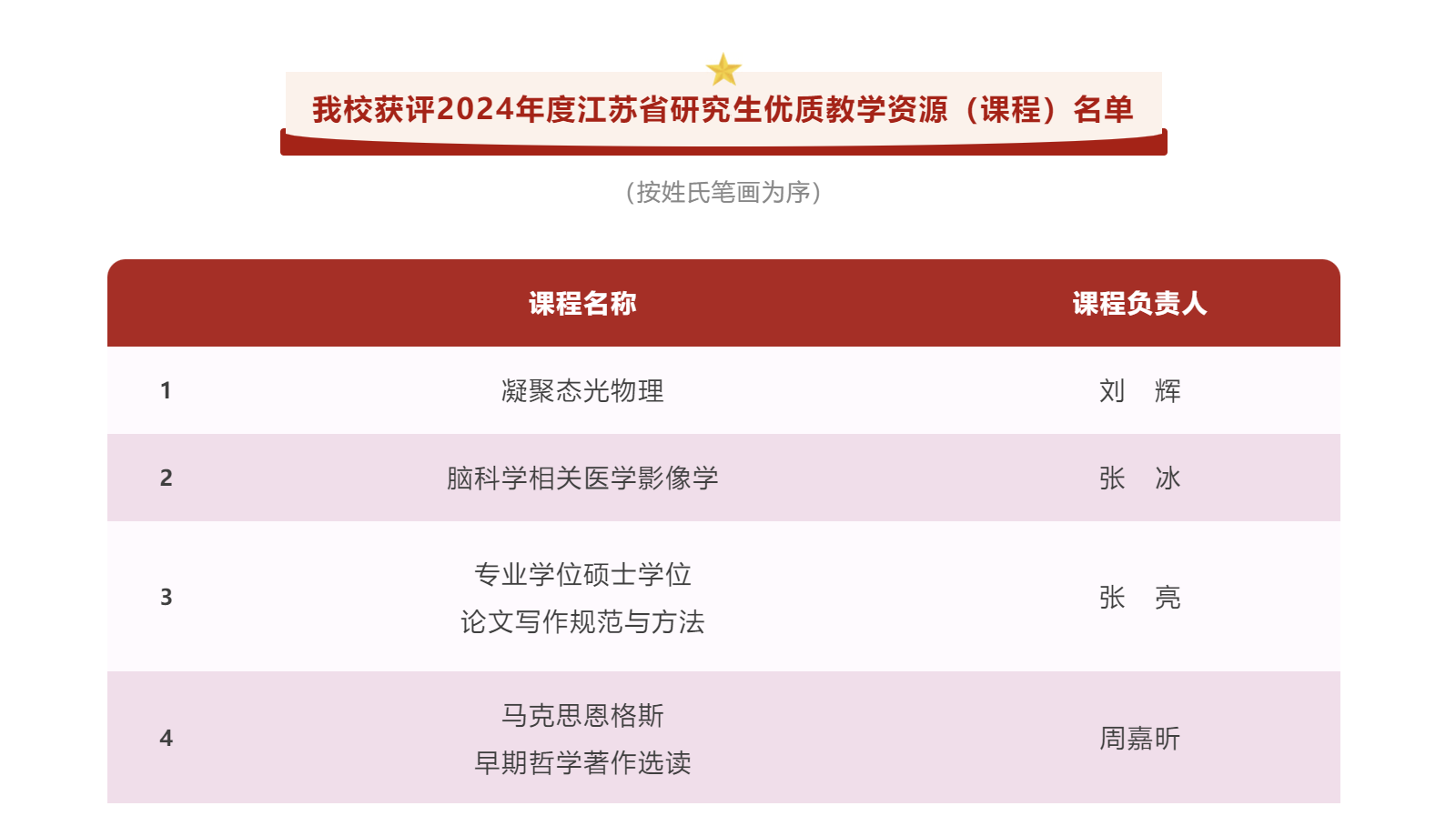 近日,江苏省教育厅公布2024年度研究生优质教学资源评选结果,太阳成集团tyc获评优秀研究生课程4门,其中公司本研贯通课程《脑科学相关医学影像学》课程成功入选,成为本年度江苏省唯一获此殊荣的脑科学交叉学科课程。