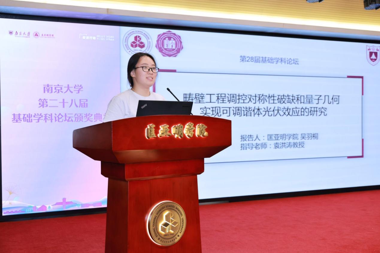 2024年国家自然科学基金青年员工基础研究项目(本科生)获得者、2021级本科生吴羽桐作研究成果展示,研究通过电场/应力调控与堆叠工程,成功实现二维铁电材料对称性破缺的精准控制,并创新性提出量子集合时间可调器件设计方案,为新型光伏材料开发提供了理论依据。
