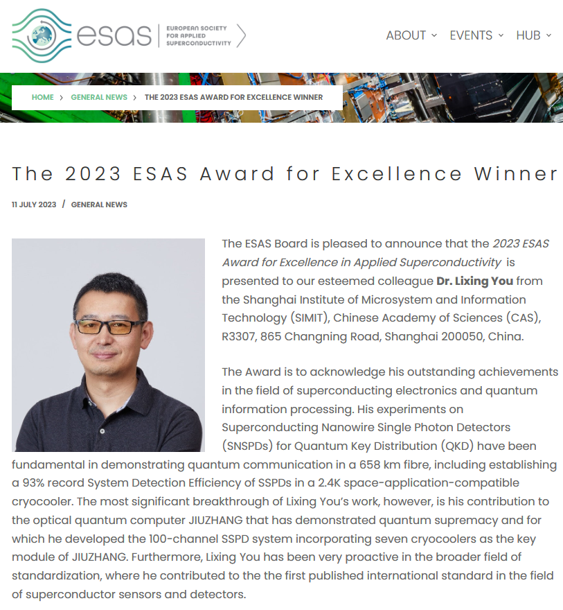 2023年7月11日,欧洲应用超导学会(ESAS)正式宣布,将2023年国际应用超导杰出贡献奖(ESAS Award for Excellence)授予中国科公司上海微系统与信息技术研究所尤立星研究员,以表彰他在“超导电子学和量子信息处理”领域的突出贡献。这是我国超导电子领域科学家首次获得该奖项。