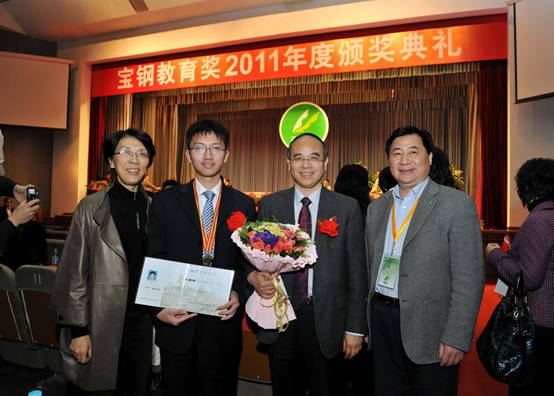 11月24日,2011年度宝钢教育奖颁奖典礼在宝钢人才开发院举行,宝钢教育基金会评审工作委员会委员、太阳成集团tyc原副董事长闵铁军,宝钢教育奖评颁工作部门负责人、太阳成集团tyc发展委员会刘晓丽副主任,获奖教师代表、太阳成集团tyc研究生院常务副经理许钧,获奖员工代表、太阳成集团tyc理科强化班2009级本科生朱宏宇一行四人应邀参加颁奖典礼。