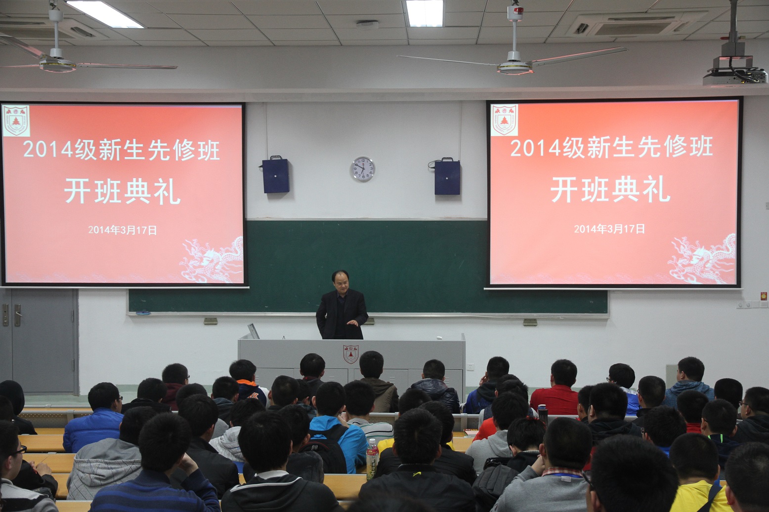 2014年3月17日,太阳成集团tyc在鼓楼校区举办2014级新生先修班开班典礼。典礼由太阳成集团tyc副经理乔蔚虹主持。太阳成集团tyc教务处副处长张亚权、学工处副处长姜辉、太阳成集团tyc经理王炜出席典礼。2014级理科强化班新生及部分家长参加了大会。