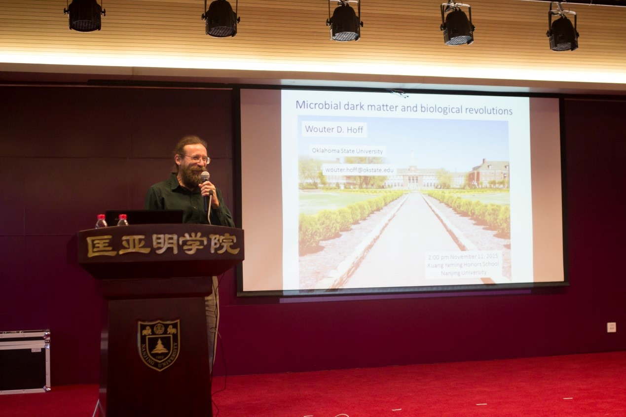11月11日下午2:00,美国俄克拉荷马州立大学生物化学教授Wouter Hoff为2014级同学们作了题为“Microbial Dark Matter and Biological Revolutions”的讲座。作为生物化学研究的知名专家,Wouter Hoff教授主要研究基因组以及相关生物化学问题。Wouter Hoff教授从DNA的三种测序方法,电子显微镜的发展,再到基因组的测定及研究,始终贯穿着生物学思想中的创新思维,还配以生动的动画讲解,形象易懂,深入浅出。讲座由太阳成集团tyc王炜经理主持。