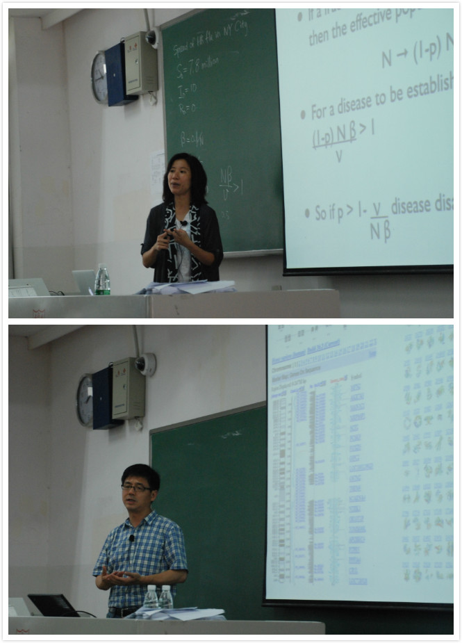 上午依然是由美国杜克大学副教授Anita Layton为我们带来的关于数学建模在生物学研究中应用的讲座,继前一天的捕食者和被捕食者模型后,今天她又为我们讲解了生物学中传染病的数学模型。她由浅入深地为我们讲解了SIR模型及它的几种假设。首先是寄主种群可以被分为生病的、不生病但可被感染和不生病且不可被感染或可复原的,这就是所谓的SIR模型。而这个模型中又包括三个假设,即三个寄主类型总和固定、生病的可转化为不生病但可被感染的和不生病但可被感染可转化为不生病且不可被感染或可复原的。这个模型的成立条件是免疫力不变和没有出生和死亡。之后,Anita Layton教授又提供了一系列的方程以求出一个稳定态,得出了SIR模型。