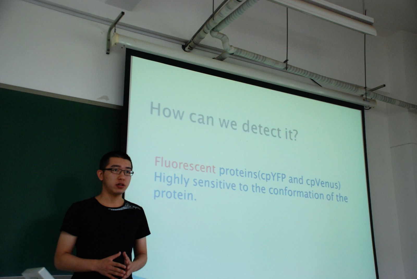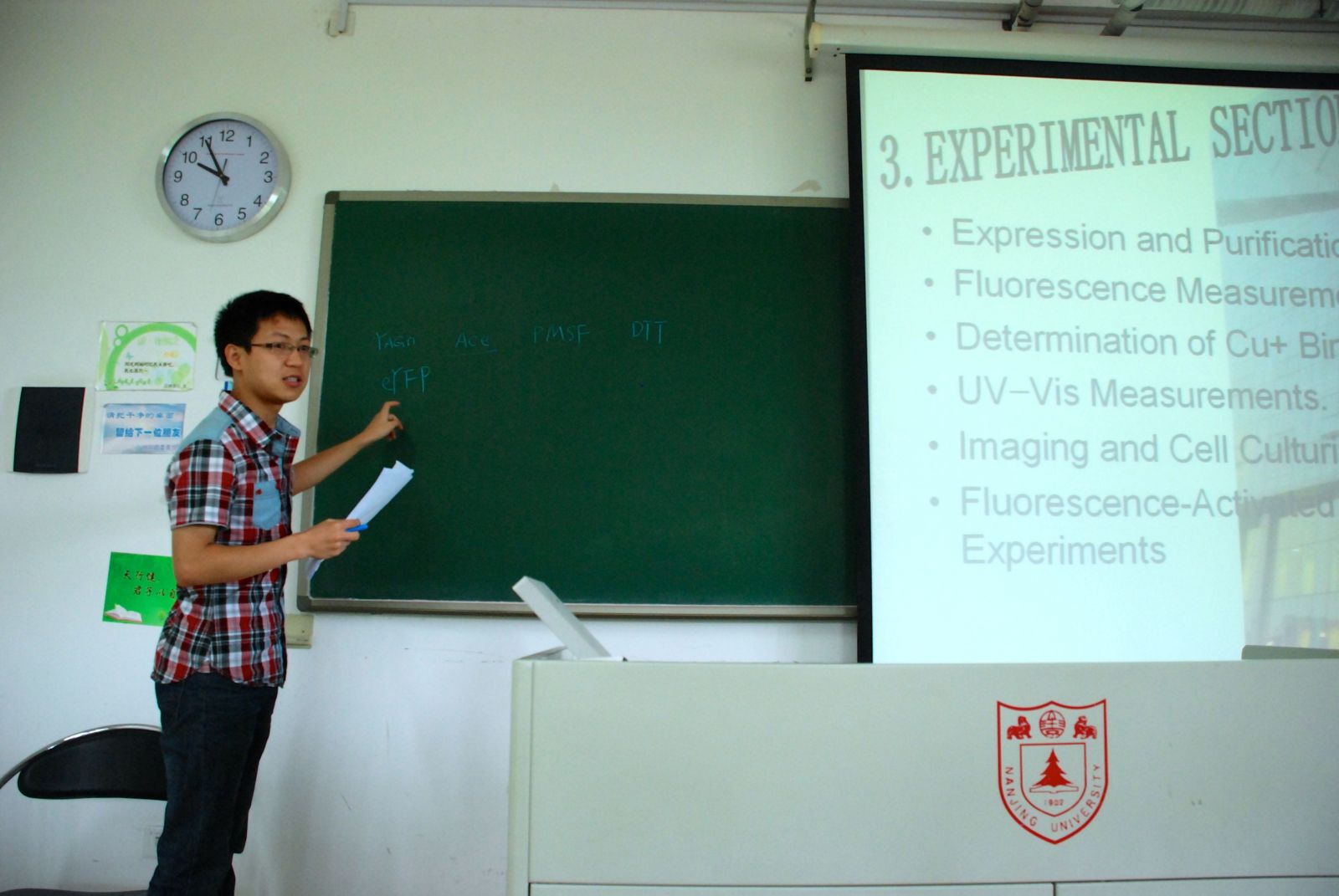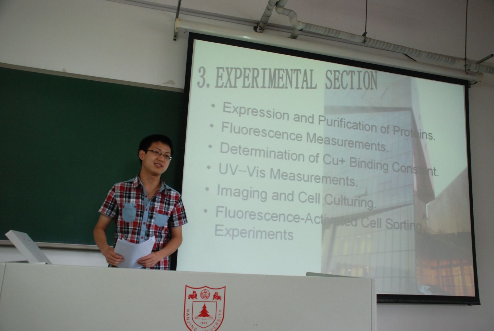 经过昨天夏老师的专题讲座,同学们回去后进行了深入思考,并各自准备了内容,于今天上午上台陈述自己对化员工物学这一领域的理解以及已经做过的一些工作。这是夏老师有意识地安排的内容,既加强了和同学们的互动和交流,给了同学们更广阔的思考和表达的空间,也给了同学们一个很好的展示的机会。同学们陈述完后,夏老师颇为赞赏,也提出了许多宝贵的意见,并鼓励同学们多看文献,多思考,多关注交叉学科的前沿研究。