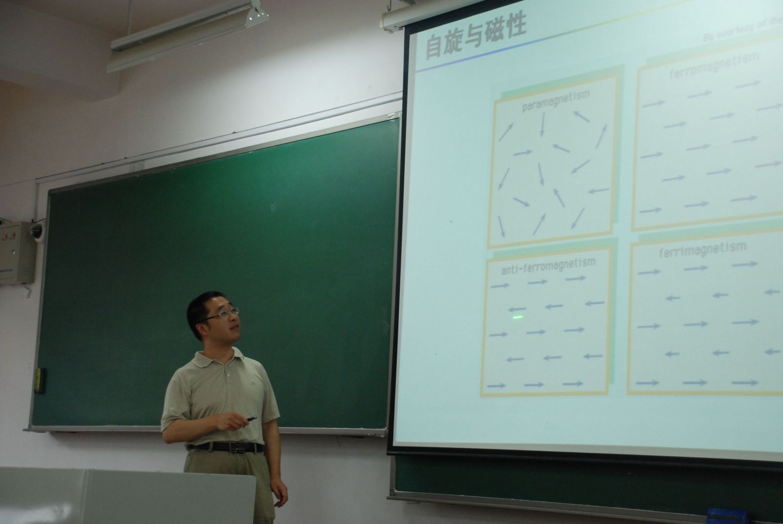下午,南大物理公司的沈瑞教授给同学们带来了一场“新奇量子输运现象及应用”的讲座。沈教授是强化部93届的系友,他很了解匡院员工的基础以及匡院的教学情况,所以这次的讲座内容是精心安排的并且很有针对性的。他从自旋的概念切入,继而介绍了与超导有关的电子输运知识,接着介绍了石墨烯和拓扑绝缘体等内容,循序渐进,令同学们更容易接受。同时,沈教授讲课风趣幽默,不时引得阵阵笑声,课堂气氛非常活跃。