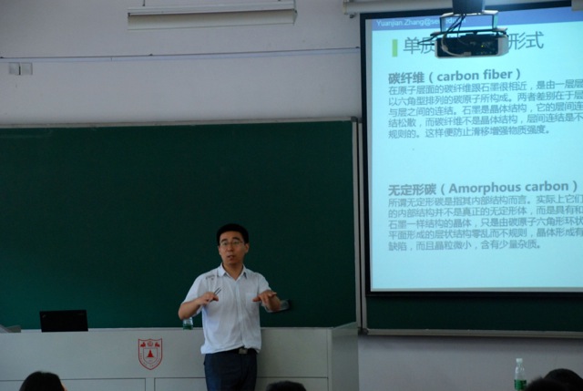 张袁健教授是匡院1998级系友,现任东南大学教授,他给大家讲述了碳纳米材料的研究发展。碳纳米材料是一种新材料,在传感器方面具有很好的研究与分析前景。张教授为同学们普及了碳纳米管、离子液体分子、石墨烯等一系列知识,介绍了新型碳纳米管材料的多种电化学性质以及在材料化学和能源领域的应用。张教授的讲座深入浅出,同学们听完都意犹未尽,纷纷提出自己的问题,现场气氛颇为热烈。