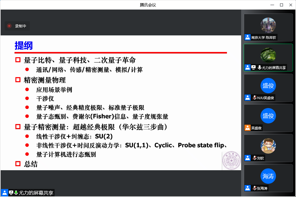 基础课程部分由该项目的负责人吴盛俊教授主持。奥地利科公司通讯院士、全国高校量子力学研究会名誉理事长、中国科学技术大学资深教授张永德先生开启了讲习班的基础课程,他主讲的《量子力学疑难争论问题概论》一共6节课,系统阐述了量子力学理论上的疑难问题,从一个全新的高度开启学员对量子计算的基础—量子力学—基本问题的思考。