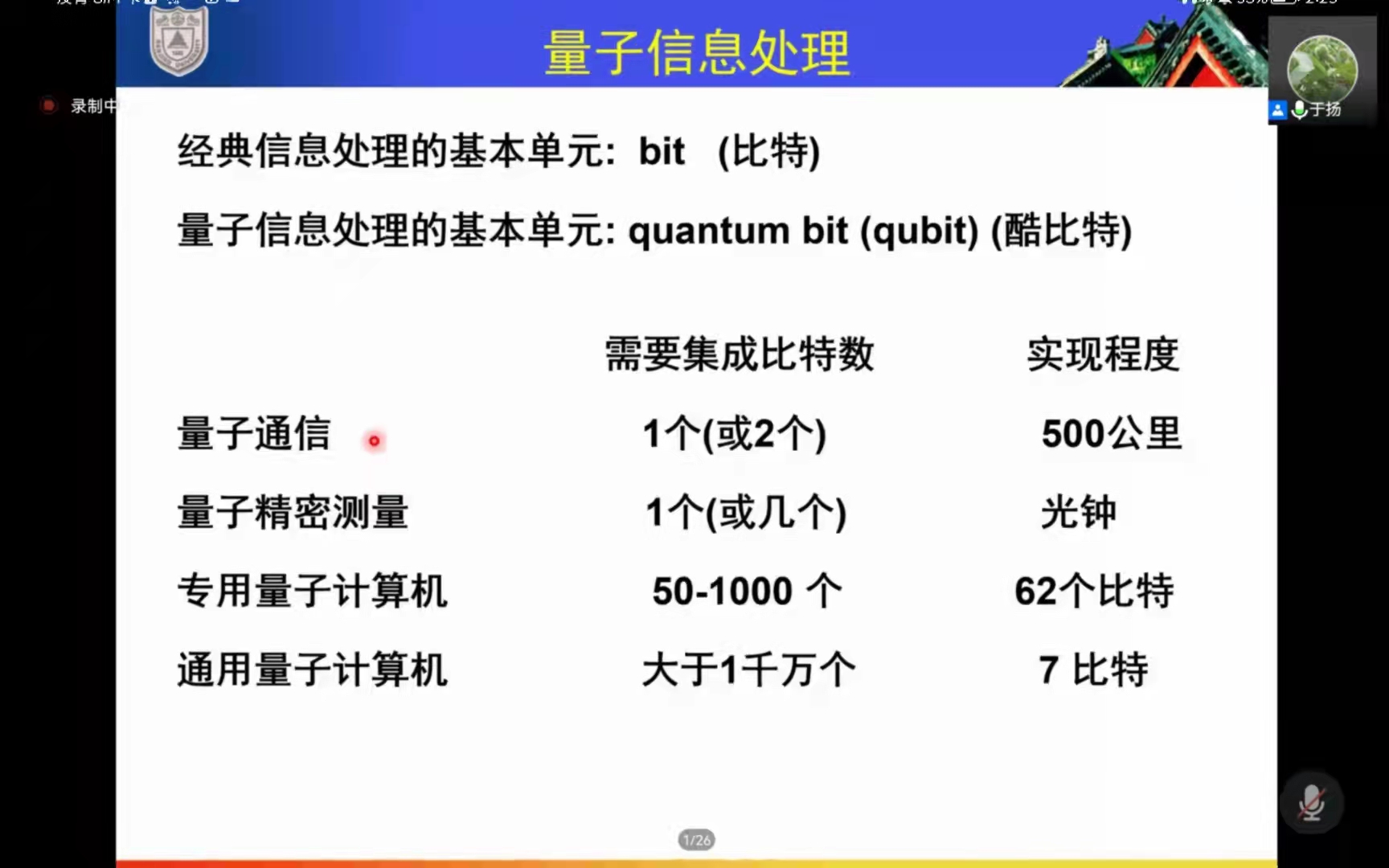 于教授提出量子信息处理这一重大课题,为我们讲解量子通信、量子精密测量、专用量子计算机与通用量子计算机四大应用领域内目前的科研成果与仍面临的应用、技术问题。