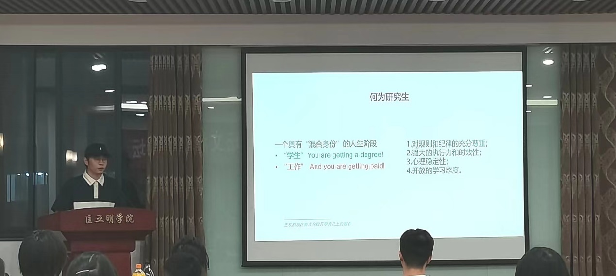 杨玉钦同学向2022级的各位研究生新同学表示热烈祝贺和欢迎。杨学长提到,研究生是一个具有“混合身份”的人生阶段,不仅需要面对员工的学习任务,同时还需要面对繁重的科研任务。因此他提供了一些建议,即对规则和纪律的充分尊重、具有坚强的执行力和时效性、心理的稳定性以及开放的学习态度。导师往往同时承担教学、科研、行政以及社会服务等义务,十分忙碌。对研究生来说,导师是最重要的学术资源,高效的沟通可以更加有效利用导师的时间和智慧。因此在与导师的沟通方面,学长给予了很多策略,比如在每次与导师沟通时需要先将自己课题的背景以及之前的进展简单总结给导师,以此达到高效沟通的目的。同时,学长还特别提醒,研究生阶段可能会面临压力大、焦虑等心理问题,大家可以利用组内、院内、校内等各种资源及时排解,确保心理健康的完成学业。