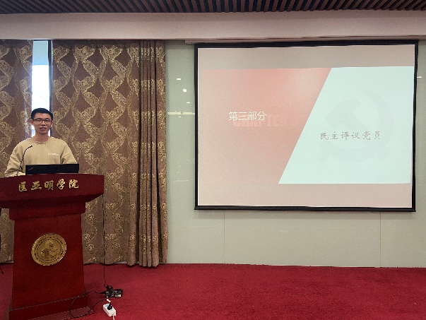 The second item on the agenda was the probationary party members' conversion to regular members' oral defense, which was conducted by six students, including Wu Yuxin, Gu Rui, Wang Zi’ang, Liu Jiaxin, Wang Xiaoru, and Wan Rongyu. The six students demonstrated their progress and achievements during their probationary period from various aspects such as ideological thinking, learning, scientific research, and social practice. They summarized the existing problems and deficiencies and expressed their determination to join the Communist Party of China once again. Secretary Zhou An congratulated the students for their progress and achievements during this period and urged them to: first, further improve their political stance, deeply understand the decisive significance of the "Two Definite", strengthen the "Four Consciousnesses," firmly establish the "Four Confidences," and achieve the "Two Maintenances." Second, maintain ideological advancement, adhere to political theory learning, and strengthen the study of the "Four Histories." Thirdly, maintain a positive attitude in action. They should use their own actions to prove themselves, be able to endure hardships and work hard, have a spirit of dedication, actively play the role of party member pioneers and models among their classmates, and serve and lead their peers.