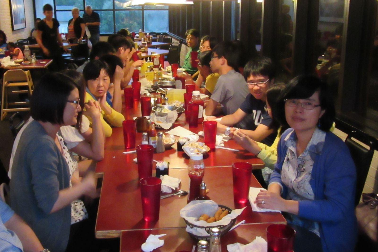 Professors from different departments are have dinner with the team members.
